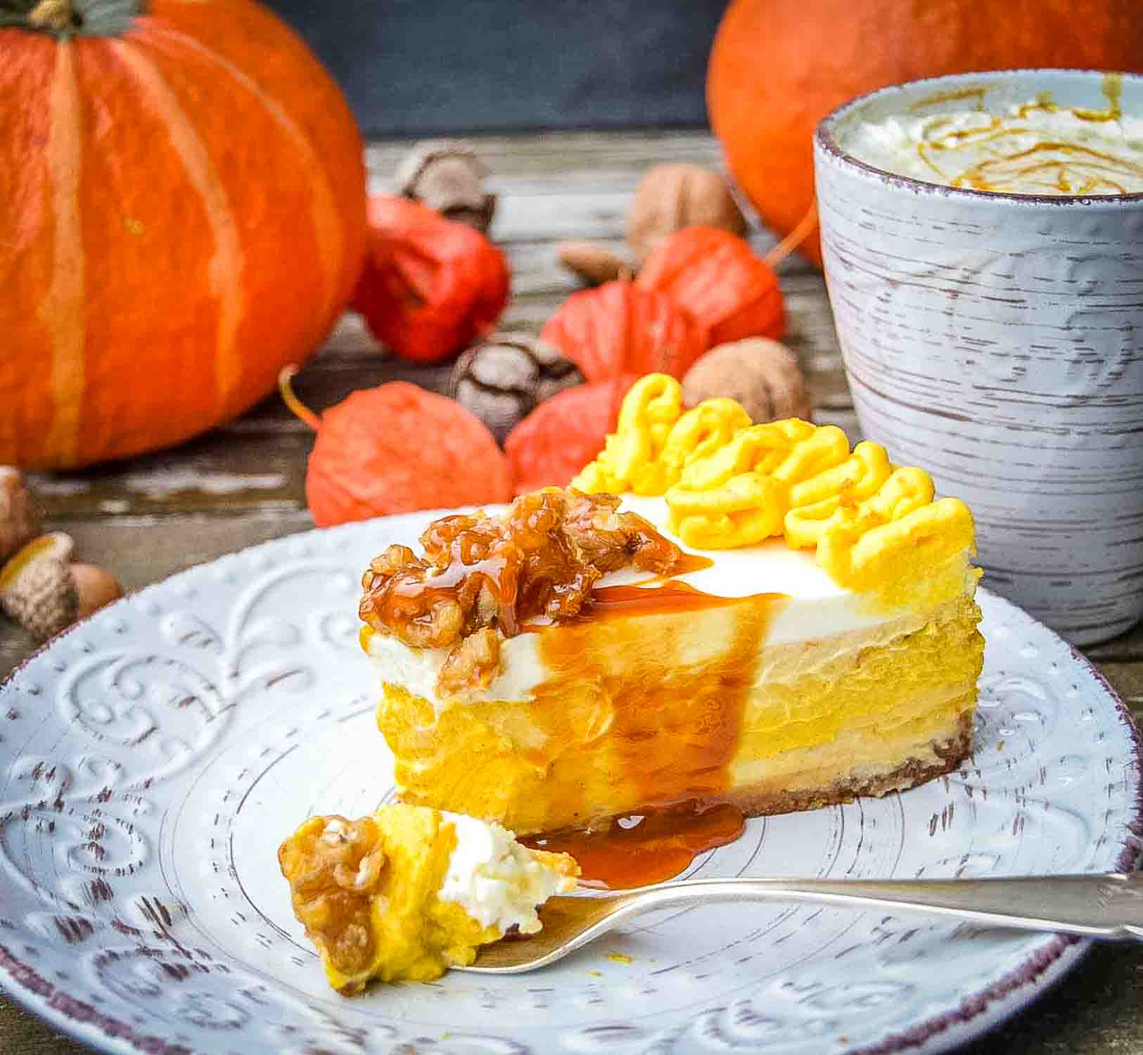 Pumpkin Cheesecake Recipe with crunchy Walnuts. Delicious creamy American style cheesecake with Hokkaido pumpkin puree, speculaas base, sour cream and cream cheese pumpkin topping decorated with caramelized walnuts. This cheesecake is simply delicious and a real eye-catcher.